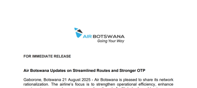 Gaborone, Botswana 21 August 2025 - Air Botswana is pleased to share its network rationalization. The airline’s focus is to strengthen operational efficiency, enhance services, improve customer access, and continue to facilitate trade and tourism.
